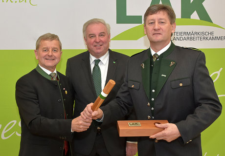 Der scheidende steiermärkische Landarbeiterkammerpräsident Ing. Christian Mandl bekam von Niederösterreichs Präsident Ing. Andreas Freistetter das Ehrenzeichen in Gold überreicht.