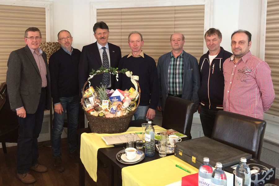NÖ LAK-Präsident Ing. Andreas Freistetter stellte sich mit einem Geschenkskorb beim ausgeschiedenen Betriebsratsvorsitzenden Karl Eibensteiner (in der Bildmitte) ein.