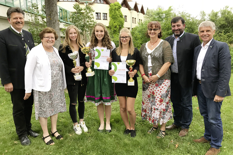 Zur besten Junggärtnerin Niederösterreichs krönte sich Carina Flasch (im Bild 4.v.l.) aus Pichl im Bezirk Neunkirchen. Dahinter landeten Christiane Gebhart aus St. Andrä/Wördern (3.v.l.) und Nina Grünstäudl aus Gutenbrunn (4.v.r.) ex aequo auf Platz zwei. Im Rahmen der Siegerehrung gratulierten u.a. auch NÖ LAK-Präsident Andreas Freistetter und NÖ Landtagsabgeordneter Josef Edlinger.