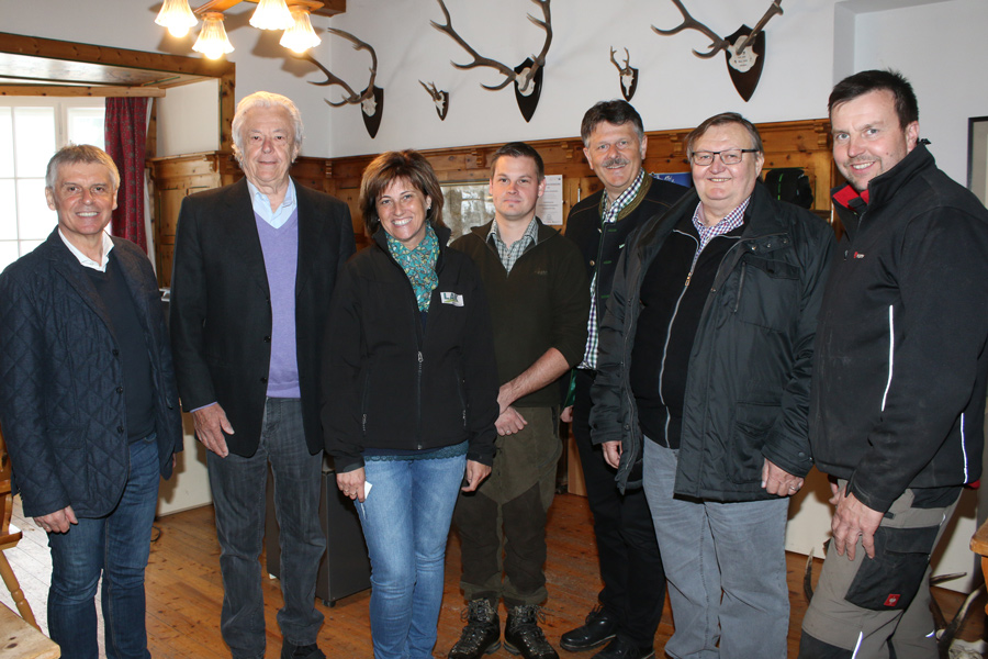 Zu Gast im Forst Gösing. V.l.n.r.: Walter Medosch, Betriebsinhaber Anton Feistl, Josefa Czezatke, Forstverwalter Christopher Schneidhofer, Andreas Freistetter, Alois Karner und Thomas Teubenbacher.