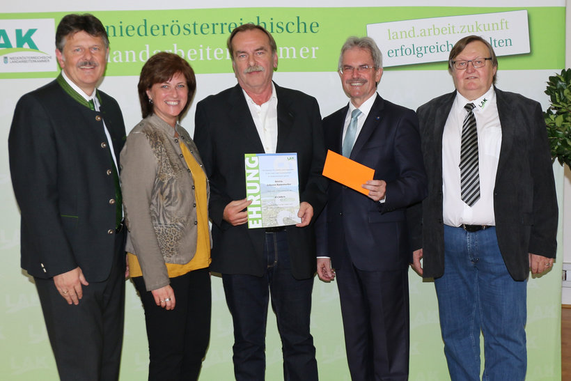 Johann Ramstorfer wurde für seine 45-jährige Tätigkeit in der Land- und Forstwirtschaft geehrt. Im Bild mit NÖ LAK-Präsident Andreas Freistetter, Vizepräsidenten Josefa Czezatke, NÖ Landtagspräsident Karl Wilfing und NÖ LAK-Vizepräsident Alois Karner.