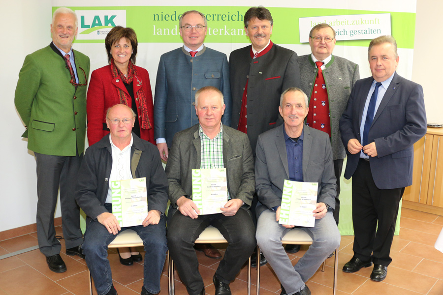 Zwettls Bezirkshauptmann Dr. Michael Widermann, NÖ LAK-Vizepräsidentin Josefa Czezatke, LH-Stellvertreter Stephan Pernkopf, NÖ LAK-Präsident Andreas Freistetter, NÖ LAK-Vizepräsident Alois Karner und LAbg. Franz Mold (stehend v.l.n.r.) mit 3 der Jubilaren, die für ihre 45-jährige Treue ausgezeichnet wurden. Sitzend v.l.: Herbert Mayerhofer, Herbert Doppler (beide aus Zwettl) und Franz Schabauer (aus Gradnitz)