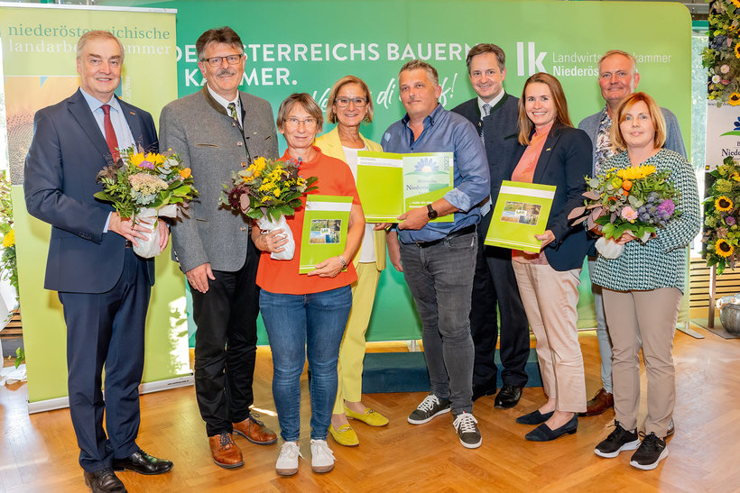 Bei der Siegerehrung in der LK NÖ in St. Pölten. WK NÖ-Vizepräsident Christian Moser, NÖ LAK-Präsident Andreas Freistetter, die Zweitplatzierte Waltraud Zwölfer, Landeshauptfrau Johanna Mikl-Leitner, NÖ LAK-Sonderpreis-Gewinner Adolf Bauer, LK NÖ-Präsident Johannes Schmuckenschlager, NÖ LAK-Kammeramtsdirektorin Bianca Pörner, NÖ Gärtner-Obmann-Stv. Ing Karl Auer und die Drittplatzierte Sonja Skarpil | Foto: Pomaßl/LK NÖ