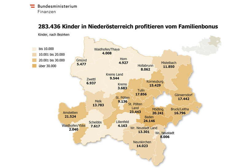 Laut Finanzministerium werden ab Jänner 2019 insgesamt 950.000 Familien mit 1,6 Millionen Kindern, davon über 280.000 in NÖ, vom neu beschlossenen Familienbonus Plus profitieren. Der Familienbonus Plus ist ein Steuerabsetzbetrag in der Höhe von bis zu EUR 1.500 pro Kind und Jahr bis zum 18. Geburtstag des Kindes. Voraussetzung für den Bezug ist der Anspruch auf Familienbeihilfe. Für Kinder ab 18 Jahren gibt es einen reduzierten Bonus von EUR 500,- jährlich.