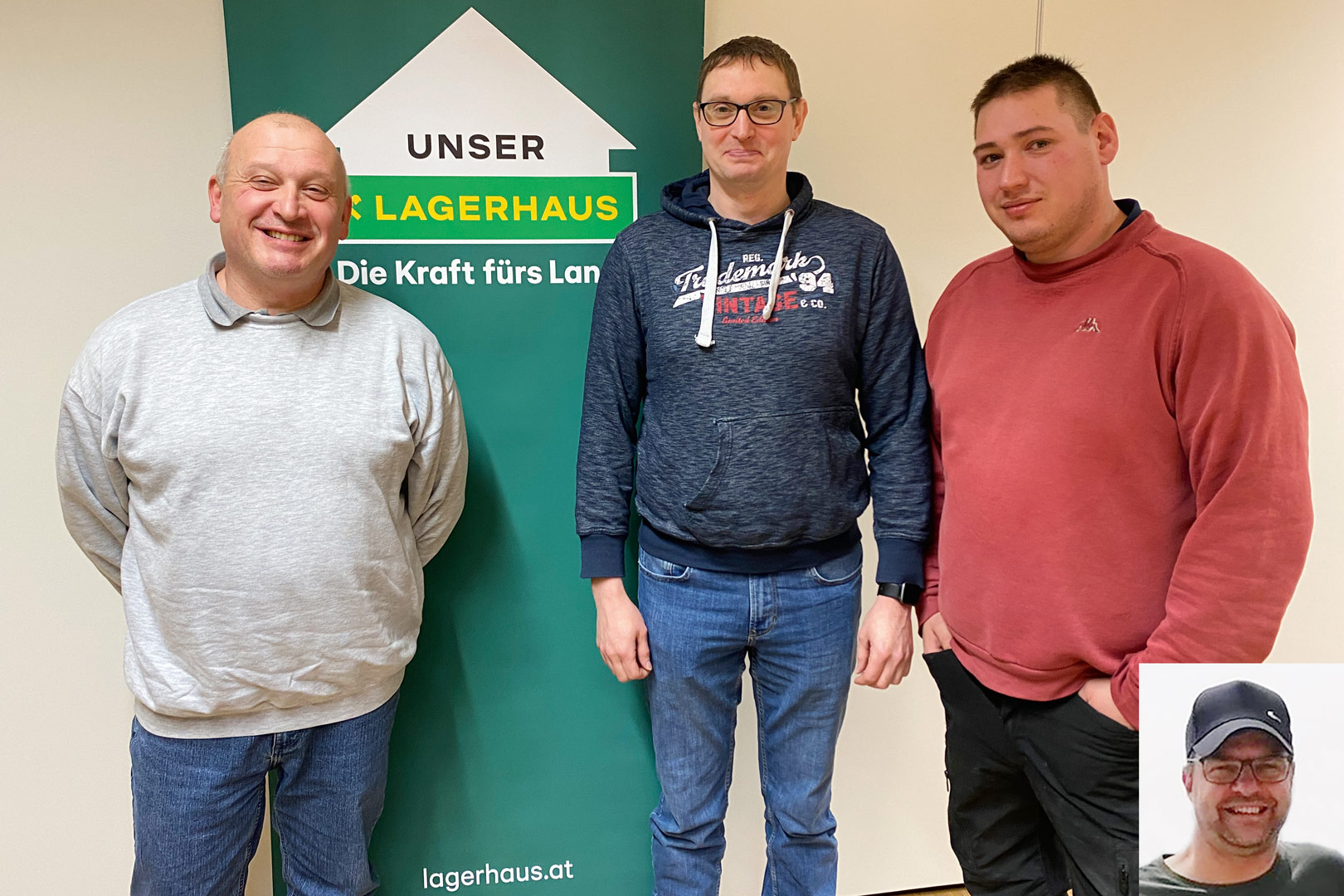 Das neue Betriebsratsteam der Arbeiter im Lagerhaus Waidhofen/Thaya. V.l.: Martin Weber, Jürgen Mayer und Clemens Datler. Porträtfoto rechts: Christian Bauer