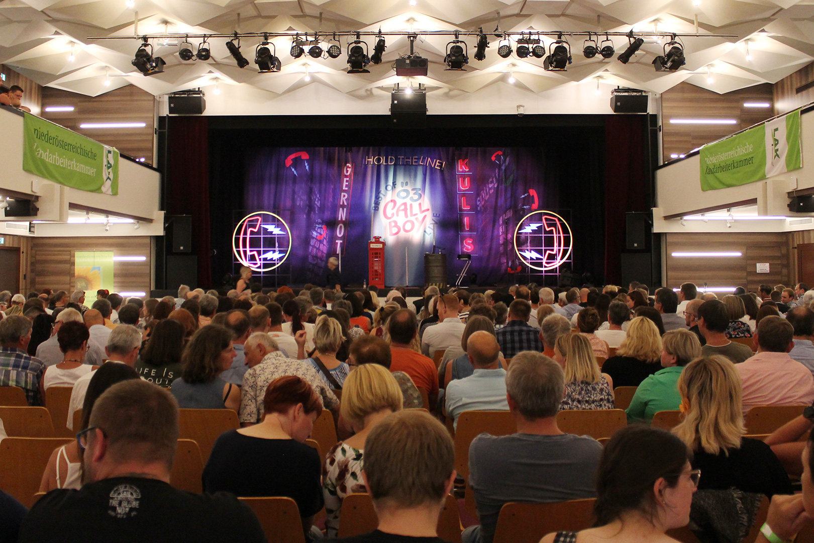 Die vierte (und vorletzte) Station der Kabarettabende mit Gernot Kulis war am Donnerstag, den 21.7.22 der Stadtsaal Hollabrunn. Bei sommerlichen Temperaturen konnte sich die NÖ Landarbeiterkammer über 350 Besucher aus dem gesamten Weinviertel freuen, darunter auch zahlreiche prominente Gäste. Begrüßen konnte NÖ LAK-Präsident Andreas Freistetter und Vizepräsidentin Josefa Czezatke u.a. den Weinviertler Landtagsabgeordneten Richard Hogl, Hollabrunns Bürgermeister Alfred Babinsky sowie HR DI Ernest Reisinger vom Amt der NÖ Landesregierung.