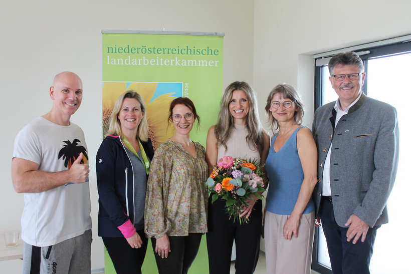 V.l.: Fitnesscoach Gerhard Laister, Kammerrätin Tanja Berger, NÖ LAK-Bildungsreferentin Sonja Hoschek, Referentin Maria Fanninger (Land schafft Leben), Fastenleiterin Andrea Löw und NÖ LAK-Präsident Andreas Freistetter