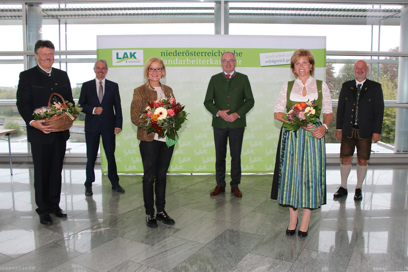 Im Sitzungssaal des NÖ Landtages startete die NÖ Landarbeiterkammer (NÖ LAK) mit ihrer konstituierenden Vollversammlung in die neue Periode. Sowohl Präsident Andreas Freistetter als auch Stellvertreterin Josefa Czezatke und Vizepräsident Karl Orthaber wurden von der neuen Vollversammlung einstimmig gewählt und im Anschluss von LH Johanna Mikl-Leitner angelobt.