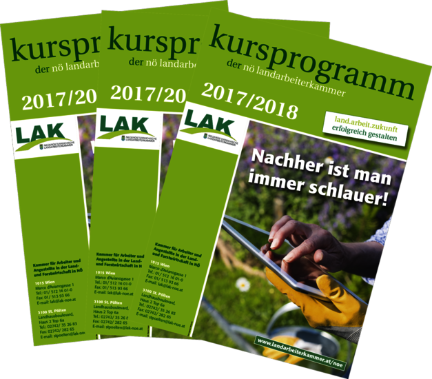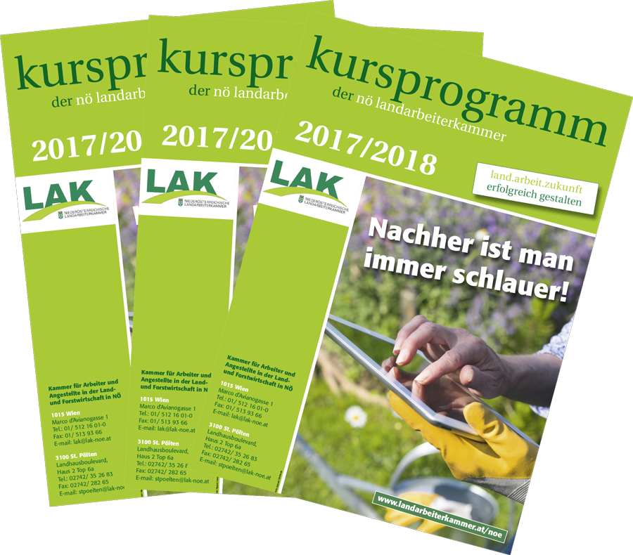 Das neue Kursprogramm 2017/18 wird seit August in den Betrieben verteilt. Wer ein persönliches Druckexemplar möchte, kann dies per E-Mail unter kurse@lak-noe.at oder telefonisch bestellen. Bei Fragen zum Kursprogramm oder bei Interesse an firmeninternen Seminaren wenden Sie sich an LAK-Bildungsreferentin Melanie Höller per E-Mail unter melanie.hoeller@lak-noe.at oder telefonisch unter 01/ 512 16 01 23.