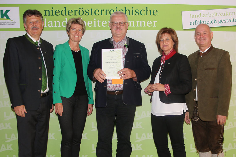 NÖ LAK-Präsident Andreas Freistetter, Nationalrätin Martina Diesner-Wais und die beiden NÖ LAK-Vizepräsidenten Josefa Czezatke und Karl Orthaber mit Jubilar Karl Ohrfandl, der als einer von 7 Jubilaren für 45 Arbeitsjahre in der Land- und Forstwirtschaft ausgezeichnet wurde.