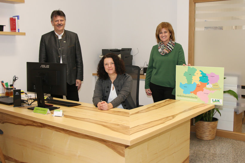NÖ LAK-Präsident Andreas Freistetter und Vizepräsidentin Josefa Czezatke statteten Geschäftsstellenleiterin Martina Münzker bereits einen Besuch im neuen LAK-Büro in Gänserndorf ab.