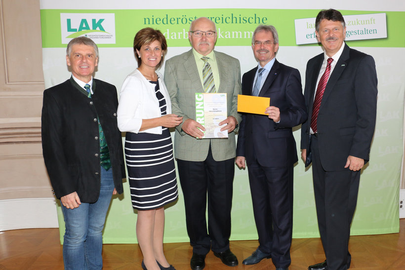 „Mit unserer Treueprämie wollen wir jenen Arbeitnehmerinnen und Arbeitnehmern danken, die der Land- und Forstwirtschaft seit vielen Jahren die Treue halten und ihre erbrachte Arbeitsleistung würdigen”, betonte NÖ Landarbeiterkammer-Präsident Andreas Freistetter. Mit Alfred Beiglböck aus Hochneukirchen (beschäftigt beim NÖ Landeskontrollverband), Oberförster Johann Karner aus Kaumberg (Forstverwaltung Smidt in Klein-Mariazell), Johann Neuhauser aus Schwechat (Raiffeisen Lagerhaus Genossenschaft) und Friedrich Silberbauer aus Klausen-Leopoldsdorf (Österr. Bundesforste) wurde 4 Jubilaren die besondere Ehre einer Auszeichnung für 45 Jahre Arbeitsjahre in der Land- und Forstwirtschaft zuteil.