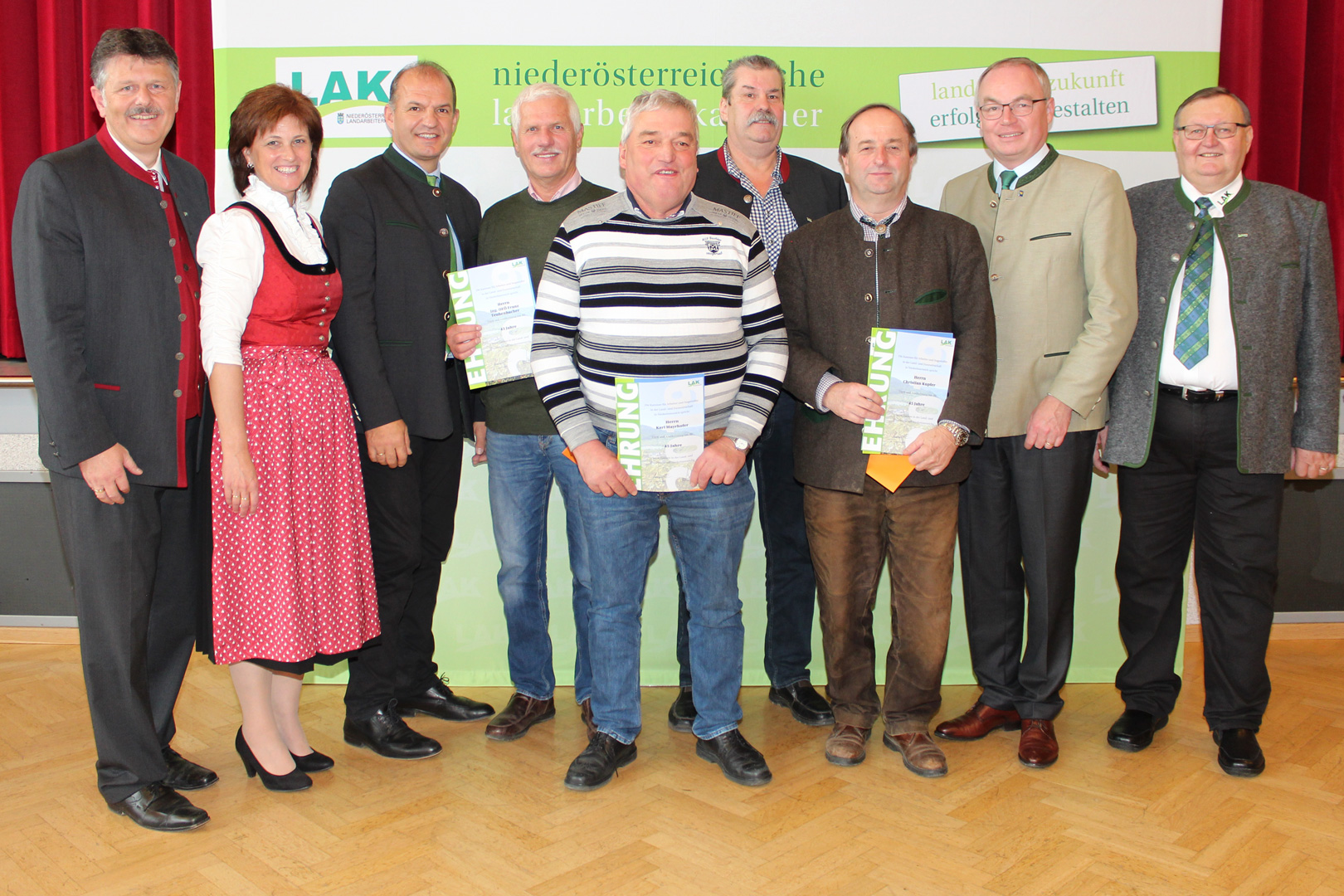 Eine besondere Ehrung wurde den Jubilaren Karl Mayerhofer (aus St. Valentin, beschäftigt im Lagerhaus Amstetten), Oberförster Ing. Franz Teubenbacher (aus Ramsau, beschäftigt im Stift Lilienfeld), Karl Ernst Jungwirth (aus Zarnsdorf, beschäftigt im Josephinum in Wieselburg) und Christian Kupfer (aus Gösing, Forst Gösing) zu teil, die für ihre 45-jährige Treue ausgezeichnet wurden und damit ihr gesamtes Arbeitsleben in der Land- und Forstwirtschaft verbracht haben.