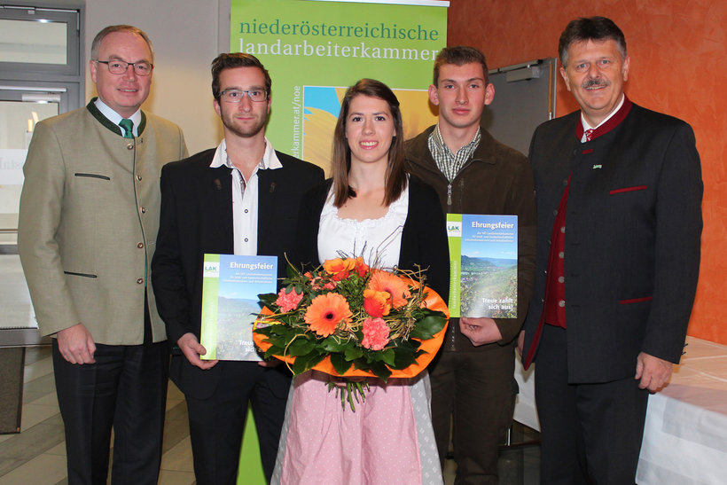 Sie sind jung, bestens ausgebildet und strotzen vor Tatendrang! Die NÖ Landarbeiterkammer zeichnete gemeinsam mit der NÖ Landwirtschaftskammer im Rahmen ihrer Ehrungsfeier in Rabenstein an der Pielach die besten land- und forstwirtschaftlichen Lehrlinge Niederösterreichs aus. Insgesamt konnten 17 frischgebackene Facharbeiterinnen und Facharbeiter für ihre ausgezeichneten Lehrabschlüsse, u.a. in den Berufssparten Gartenbau, Forstwirtschaft, Pferdewirtschaft, sowie Weinbau- und Kellerwirtschaft geehrt werden. „Mit eurem erworbenen Fachwissen und eurem Fleiß gehört ihr zu den Hoffnungsträgern für eine erfolgreiche Zukunft der Land- und Forstwirtschaft in Niederösterreich“, fand LH-Stellvertreter Stephan Pernkopf, der die Ehrung der Lehrlinge in Vertretung von Landeshauptfrau Johanna Mikl-Leitner gemeinsam mit dem LAK-Präsidium und LK NÖ-Vizepräsident Otto Auer vornahm, lobende Worte.