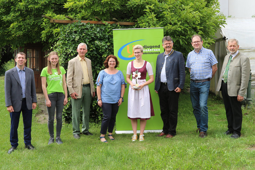 Als Gratulanten stellten sich bei der Pokalübergabe neben Freistetter auch die Leiterin der Landjugend-Gärtner Sabrina Zemlizka, der Direktor der Gartenbauschule Langenlois Franz Fuger, Ing. Herbert Stifter von der AUVA, DI Christian Kornherr von der Lehrlings- und Fachausbildungsstelle der NÖ Landwirtschaftskammer sowie Vertreter der örtlichen Bezirksbauernkammern ein.