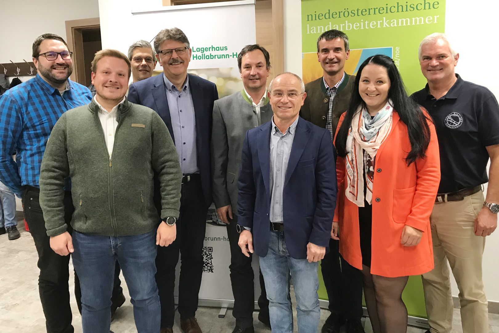 Bei der Betriebsversammlung. V.l.: Jörg Treiber (GPA), Robert György (GPA), LAK-Geschäftsstellenleiter Oliver Hauer, NÖ LAK-Präsident Andreas Freistetter, Helmut Gessl (BRV Angestellte Agrar), Hubert Müller (BRV Angestellte Technik), KR Franz Sigl (BRV Arbeiter Agrar), LAK-Geschäftsstellenleiterin Maria Wurzer und Herbert Böhm (PRO-GE).