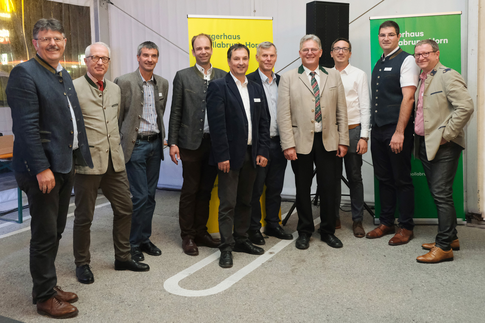 Beim Mitarbeiterfest. V.l.: NÖ LAK-Präsident Andreas Freistetter, Helmut Raunig (RWA), Betriebsrat Franz Sigl, Aufsichtsratsvorsitzender Andreas Boigenfürst, Betriebsrat Helmut Gessl, Obmann-Stellvertreter Gerhard Ratsch, Obmann Johann Rohringer, Obmann-Stellvertreter Martin Müllner sowie die Geschäftsführer Rudolf Grubauer und Josef Sieber (v.l.).
