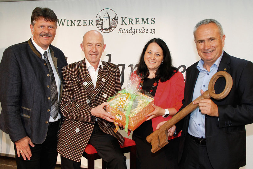 Bei der Kellerschlüsselübergabe: NÖ LAK-Präsident Andreas Freistetter, Direktor Franz Ehrenleitner, LAK-Geschäftsstellenleiterin Maria Wurzer und der neue Geschäftsführer der Winzer Krems Ing. Ludwig Holzer (v.l.n.r.). Foto: NÖN/Martin Kalchhauser