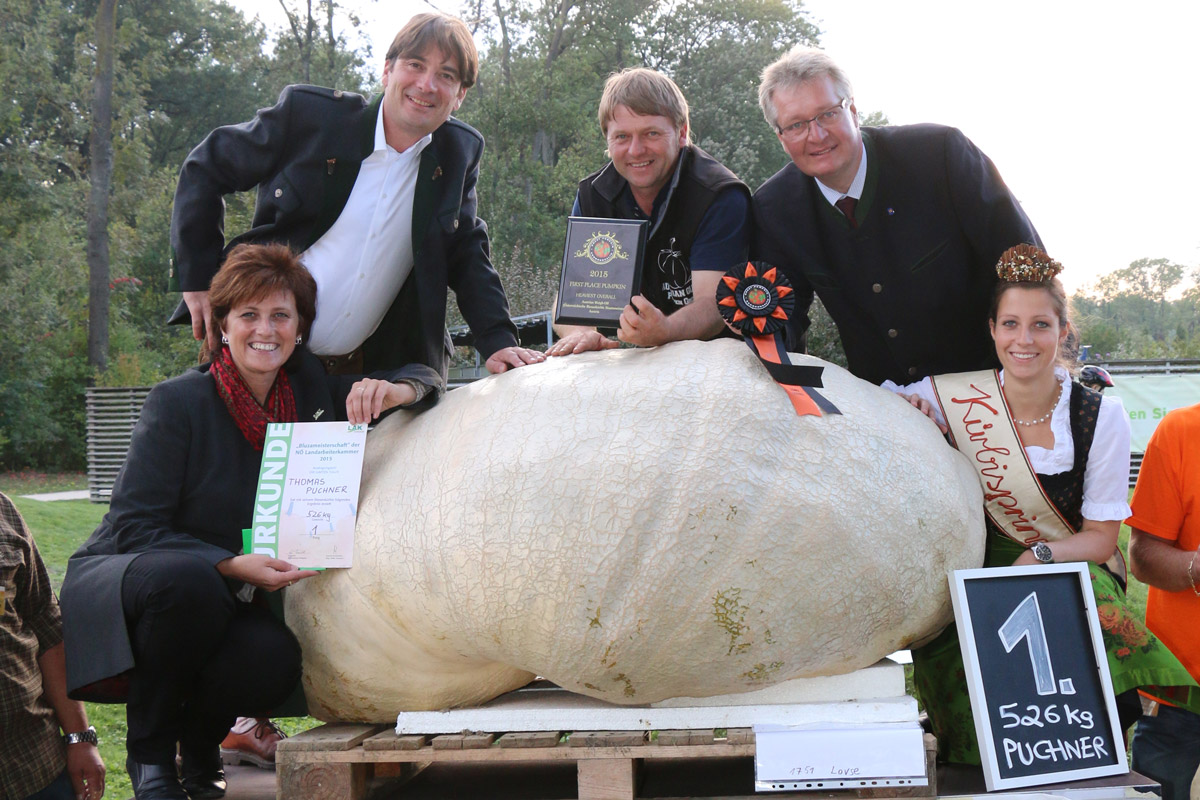 Bereits im Vorjahr war er knapp dran, heuer klappte es mit Platz eins. LAK-Mitglied Thomas Puchner, der im Raiffeisen Lagerhaus Korneuburg am Standort in Ernstbrunn als Angestellter beschäftigt ist, brachte bei der Riesenkürbis-Staatsmeisterschaft den schwersten Riesenkürbis aller 29 Teilnehmer auf die Waage und krönte sich damit zum zweiten Mal nach 2011 zum besten aller österreichischen Riesenkürbiszüchter.