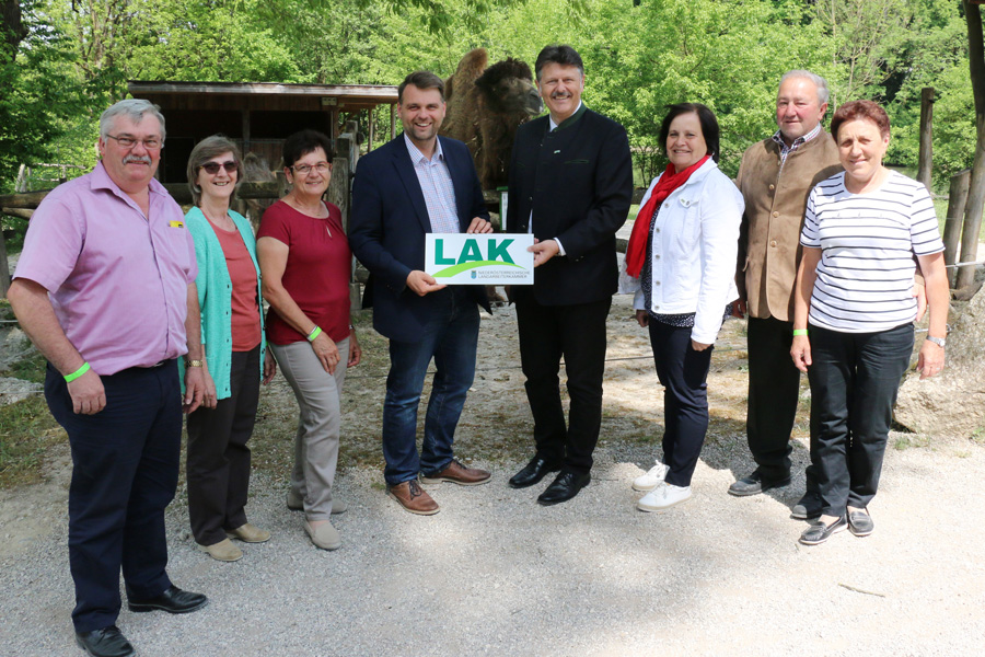 Im Tierpark der Stadt Haag konnten die LAK-Seniorinnen und Senioren einen Blick auf über 70 verschiedene Tierarten werfen. V.l.n.r.: Franz Ipsmüller, Anna Braunstingl, Anna Hrabal, Haags Bürgermeister Lukas Michlmayr, Trampeltier Altan, NÖ LAK-Präsident Andreas Freistetter, NÖ LAK-Seniorenvertreterin Herta Zesch sowie Johann & Erika Rindhauser.