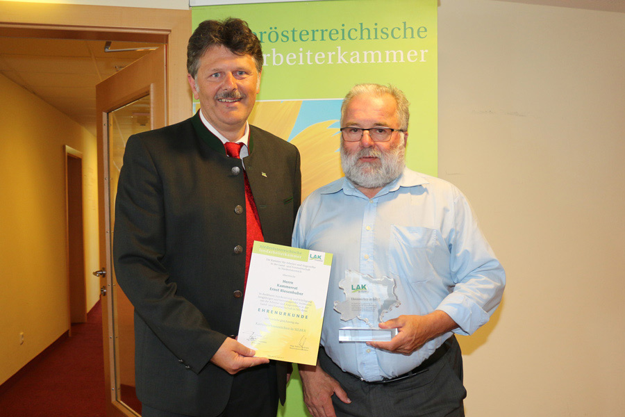 Seit Oktober 2003 war Ernst Riesenhuber als Kammerrat der NÖ Landarbeiterkammer tätig. Beruflich war der Dürnsteiner (Bez. Krems-Land) über viele Jahre dem Weinbau verbunden, arbeitete beim Dinstlgut Loiben und später bei der Domäne Wachau. Nach fast 14 Jahren als LAK-Funktionär, in dem er u.a. dem Kontrollausschuss angehörte, legte er im Zuge der Vollversammlung im Hotel Römerhof in Tulln sein Mandat zurück. Für seine langjährigen Verdienste als Kammerrat wurde der 61-Jährige von Präsident Ing. Andreas Freistetter mit dem Ehrenzeichen der NÖ Landarbeiterkammer in Silber ausgezeichnet.