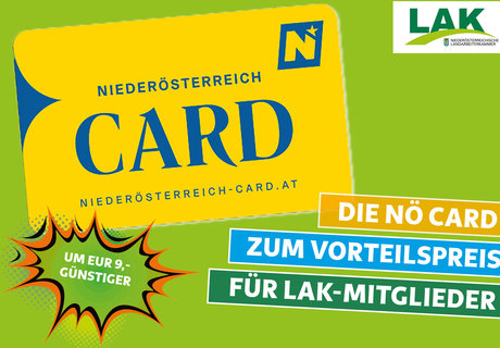 Mitglieder der NÖ Landarbeiterkammer können die Niederösterreich-CARD für die Saison 2024/25 zum Vorteilspreis erwerben und EUR 9,- sparen.